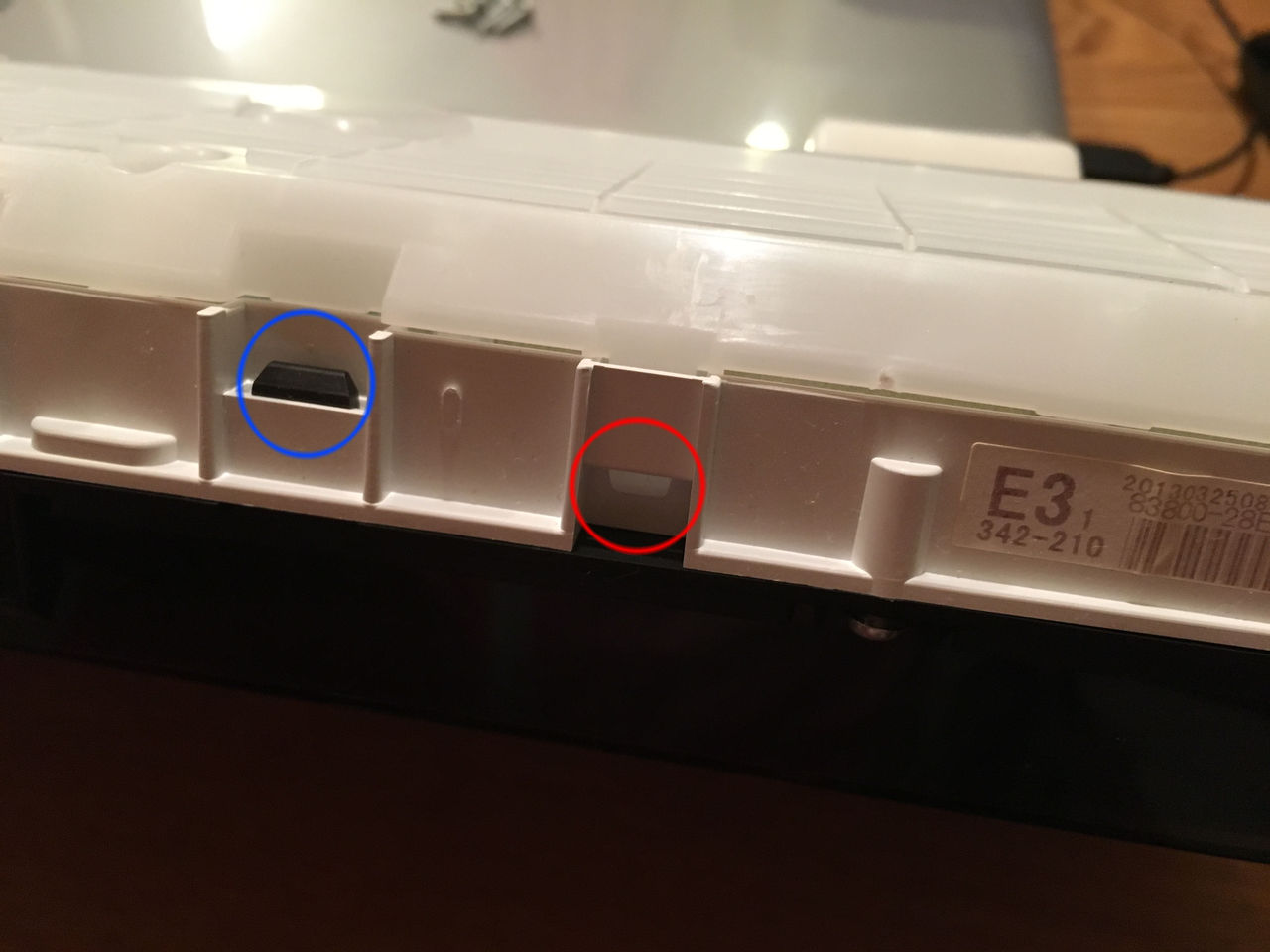 メーター裏側の白いケースを取り外すのに、赤〇部のビスを外します。